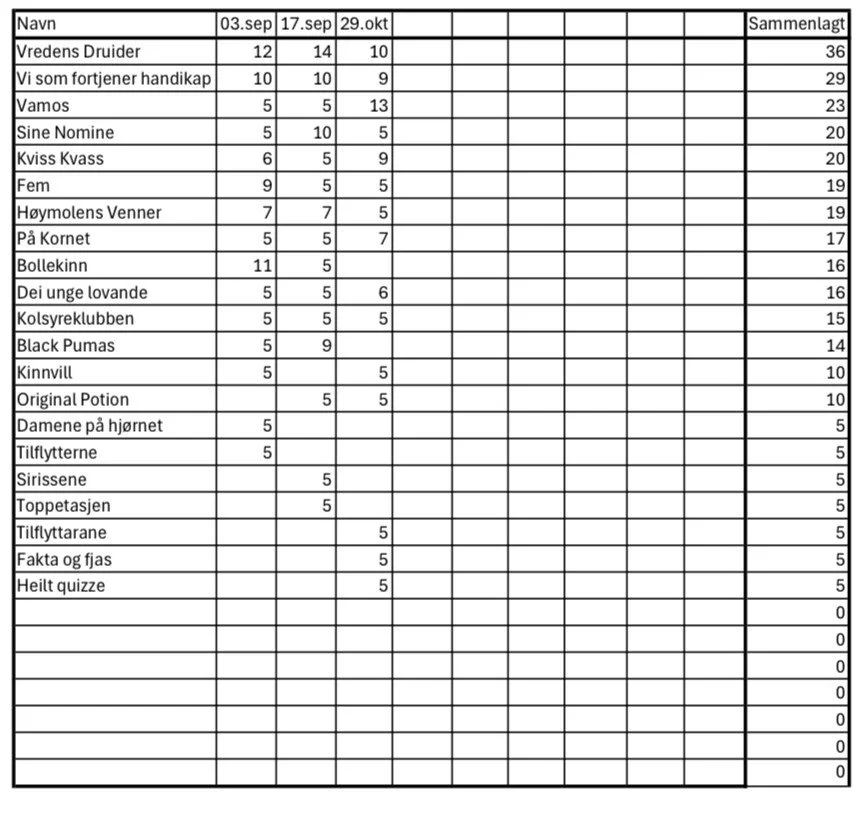 Billettar på Vesle Kinn 29.10.2025 kl 19.00: Quiz26.11.25 kl 19.00: Quiz10.12.25 kl 19.00: Quiz Andre ting som skjer på Vesle Kinn Quiz-ranking